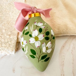 Hand Painted Dogwood Flower Ornament, Sage Green with White Flowers and Bulb Shape